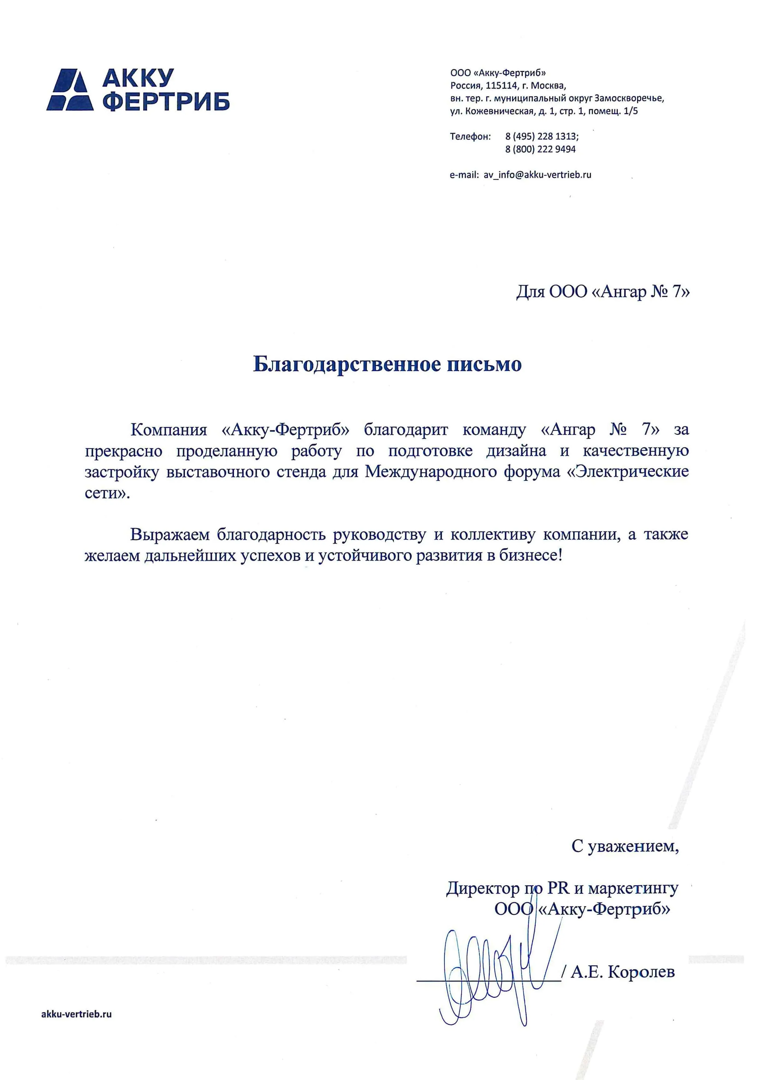 Компания "Акку-Фертриб" благодарит команду "Ангар №7" за прекрасно проделанную работу по подготовке дизайна и качественную застройку...