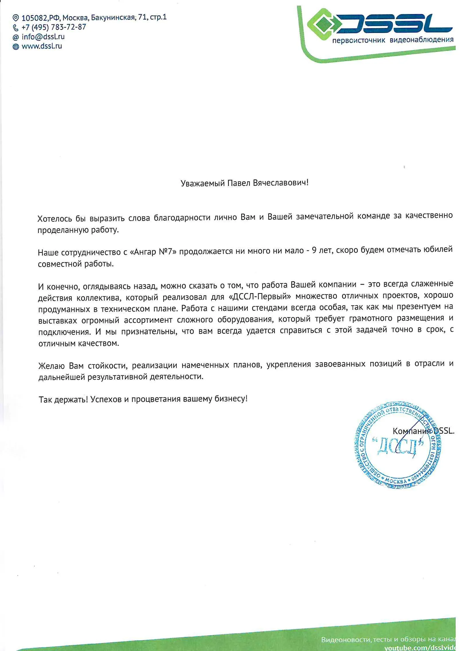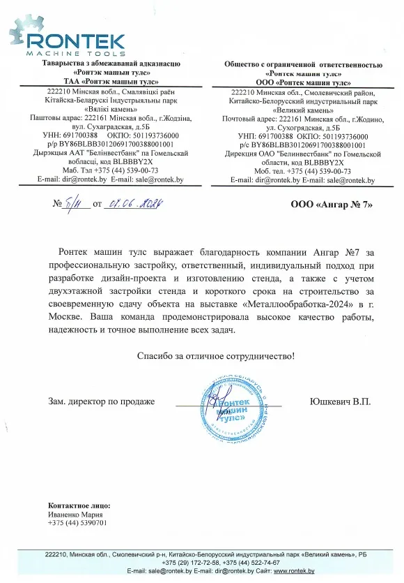 Уважаемый Павел Вячеславович! Выражаем благодарность Вам и всем сотрудникам ООО "Ангар №7" за отличную реализацию проекта стенда...