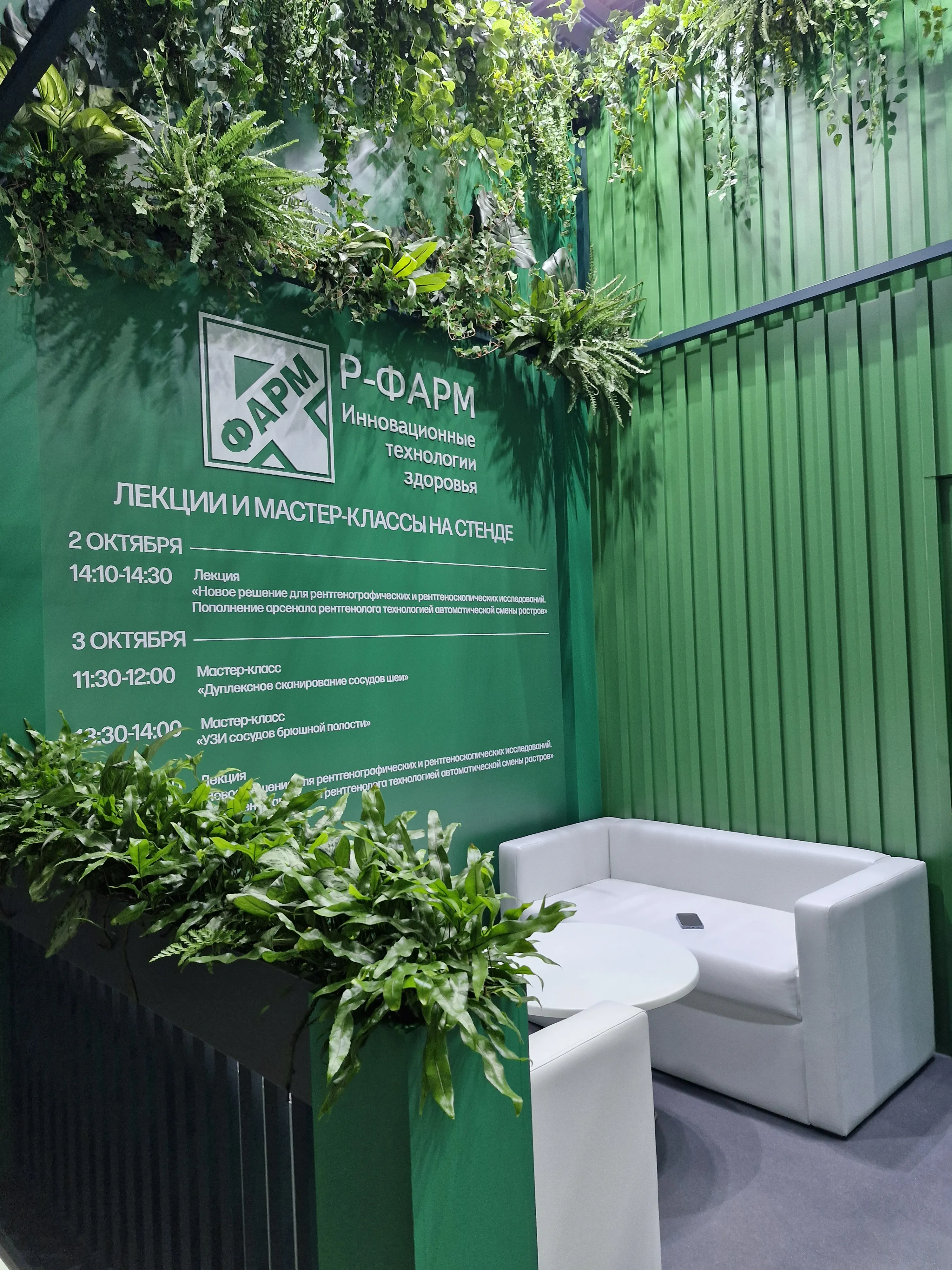 - Вертикальные зелёные панели и фитостены. Популярное трендовое решение с использованием мха, плюща и других растений, которое визуально оживляет стенд и выделяет его на фоне других. Могут выполняться из горшечных, стабилизированных или искусственных растений.