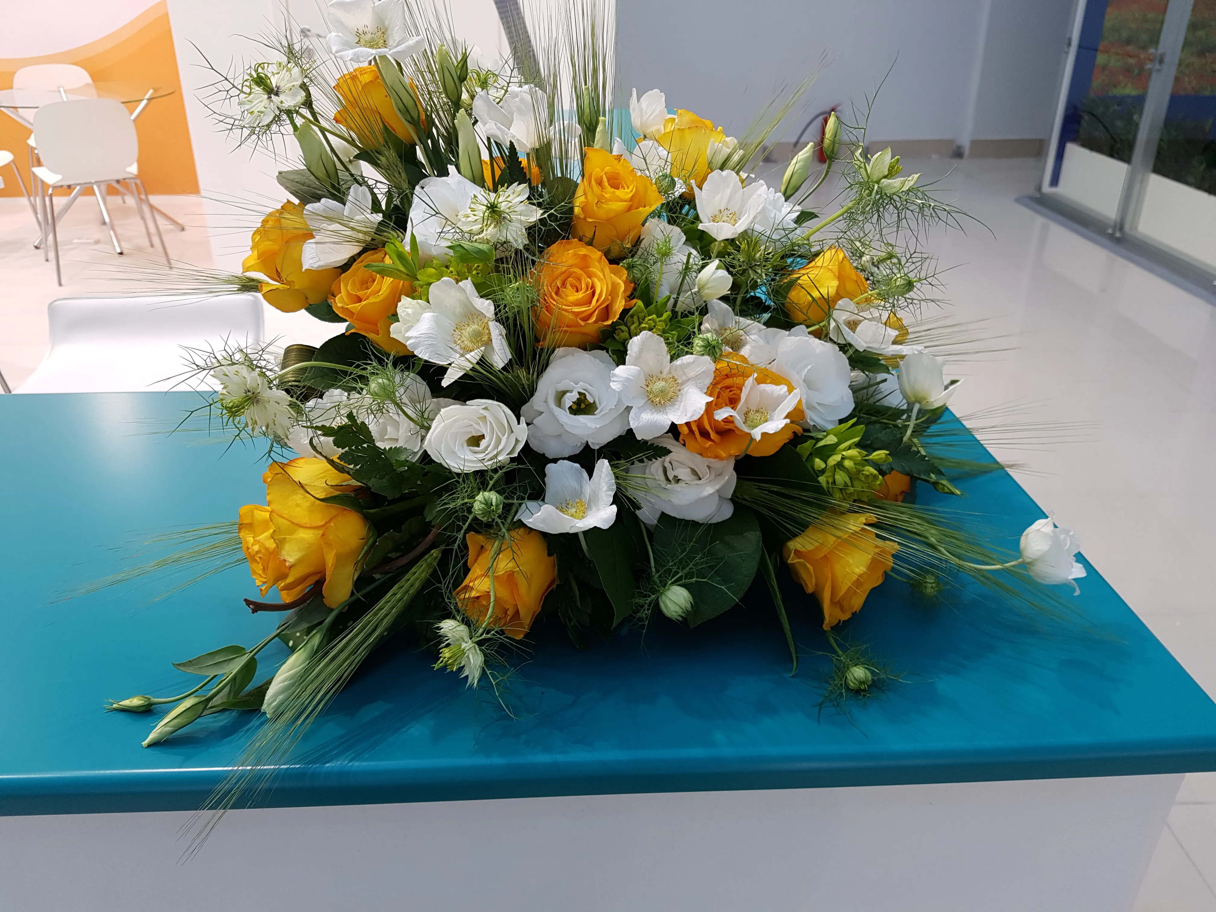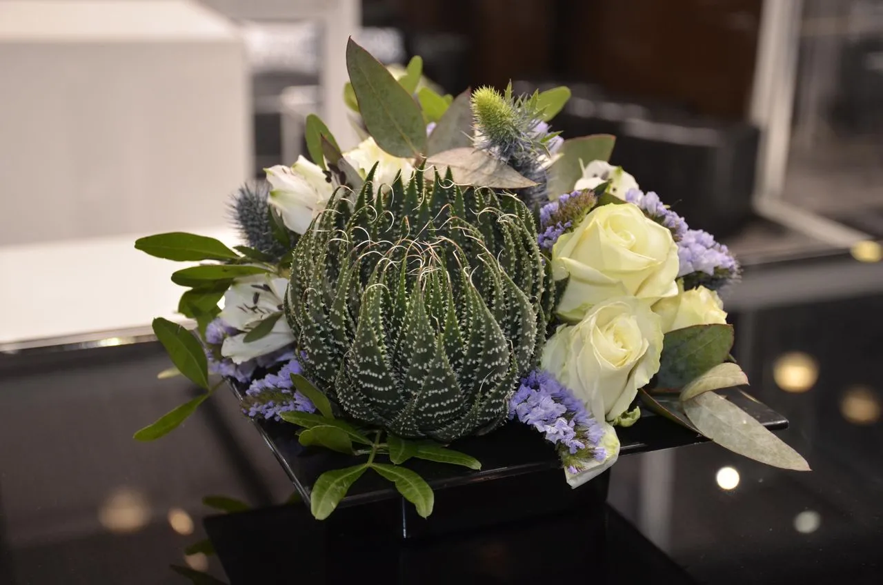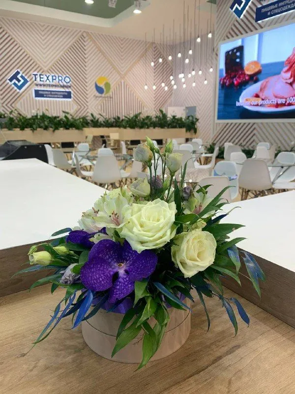 - Живые цветочные композиции. Свежие букеты и аранжировки придают стенду яркость, изысканность и живую энергетику. Такие цветы привлекают взгляды и создают приятное впечатление, но требуют регулярного ухода во время выставки.