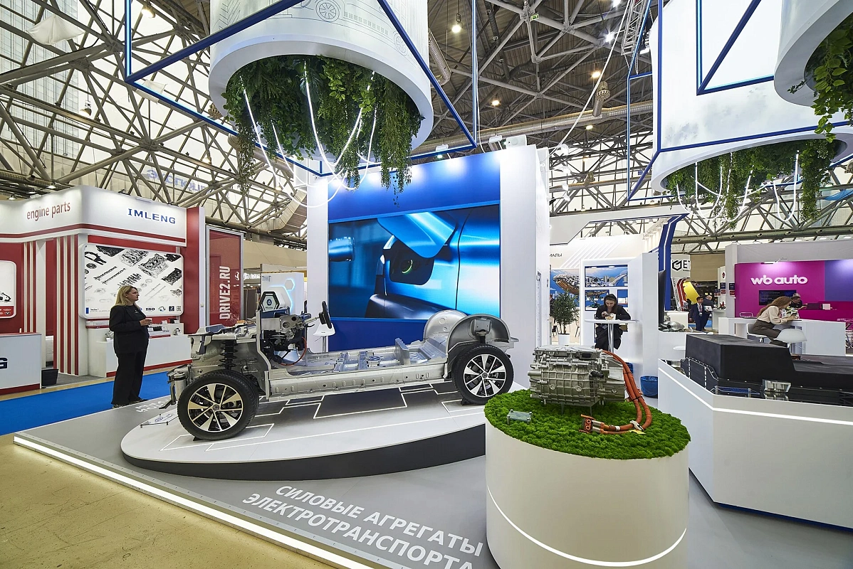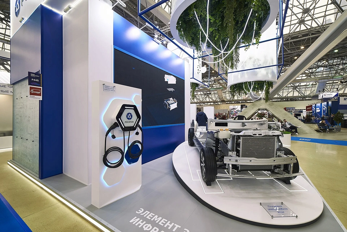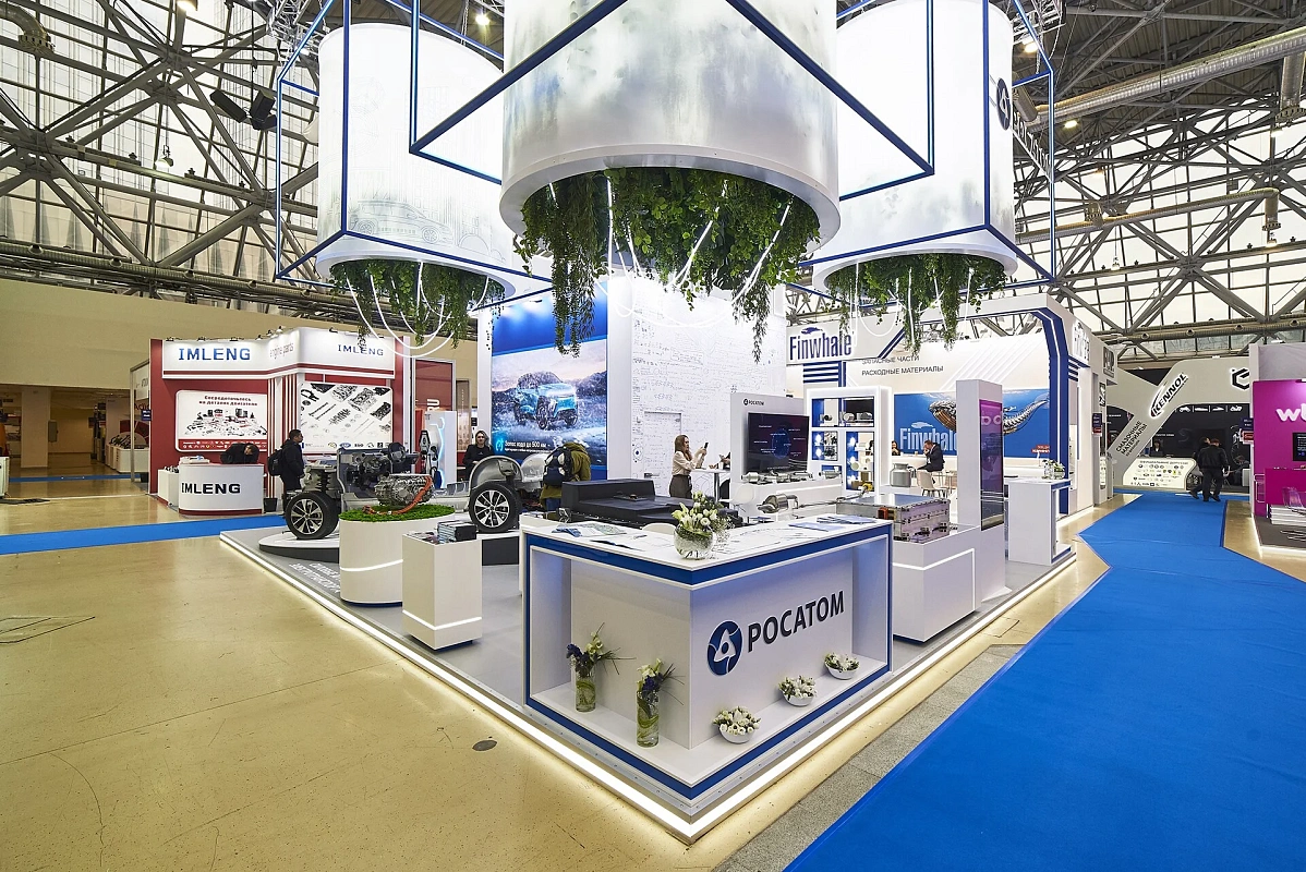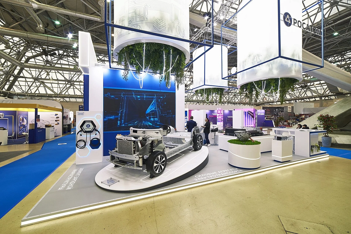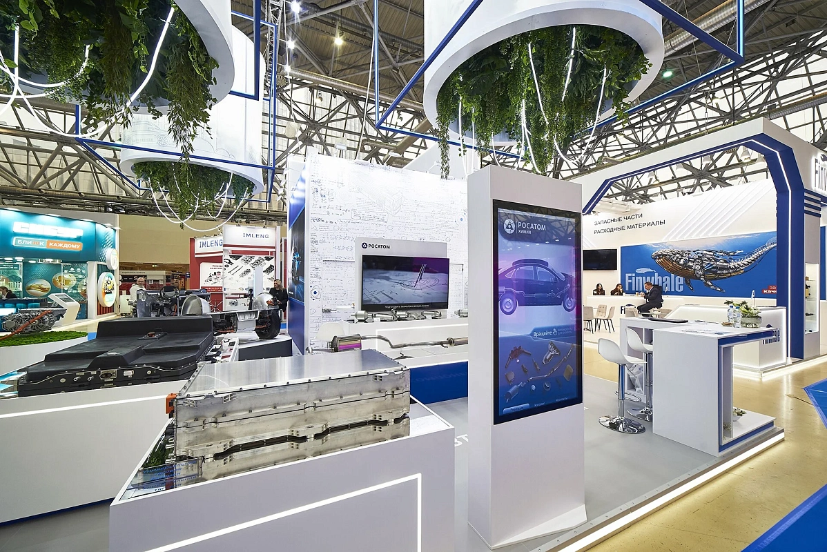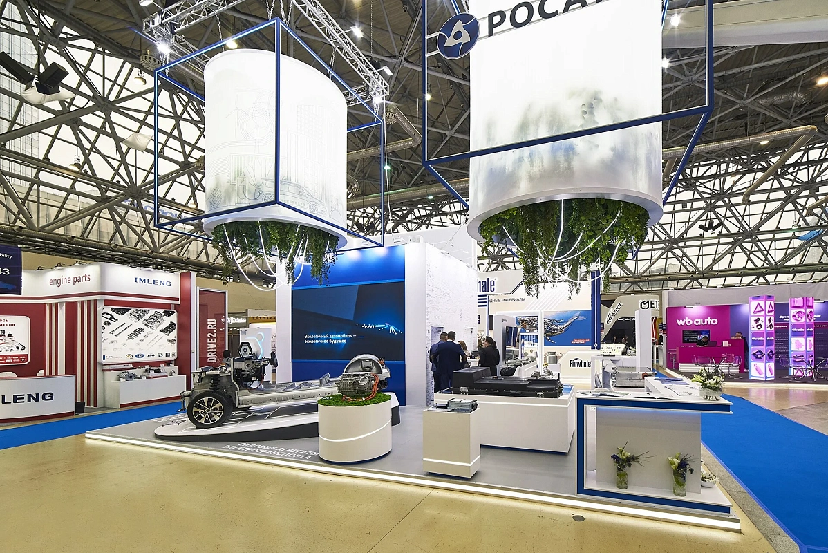 Световой подвес, подсветки создают ощущение легкости и воздушности. Вся площадь стенда максимально адаптирована для демонстрации продукции – от платформы электромобиля до мелких деталей.