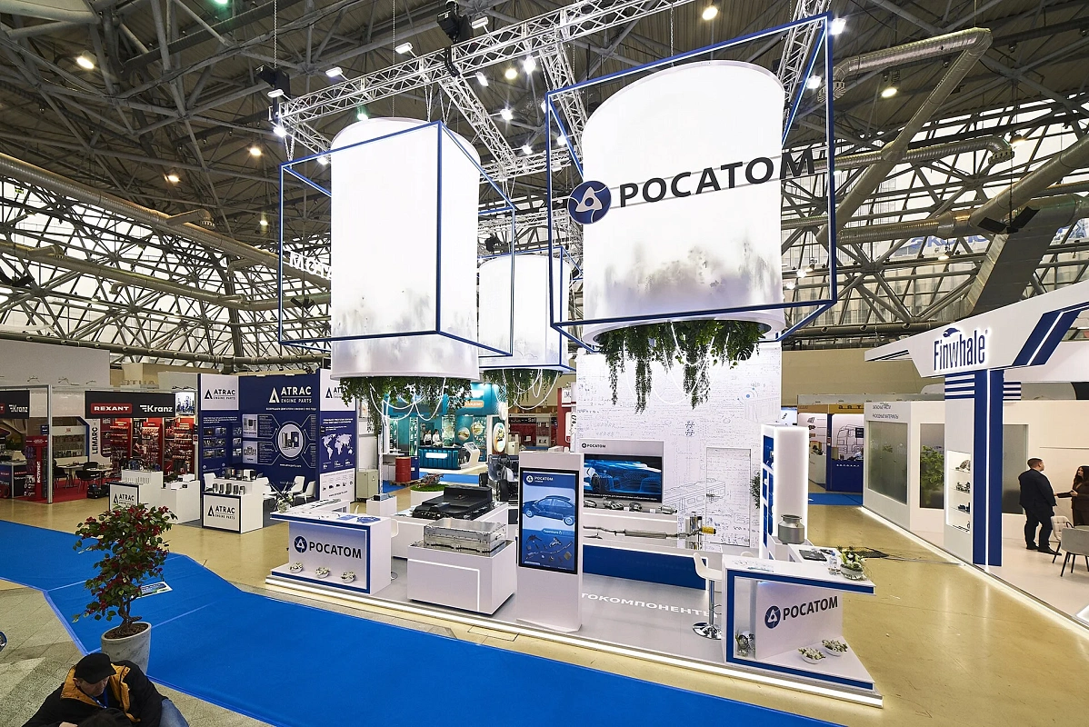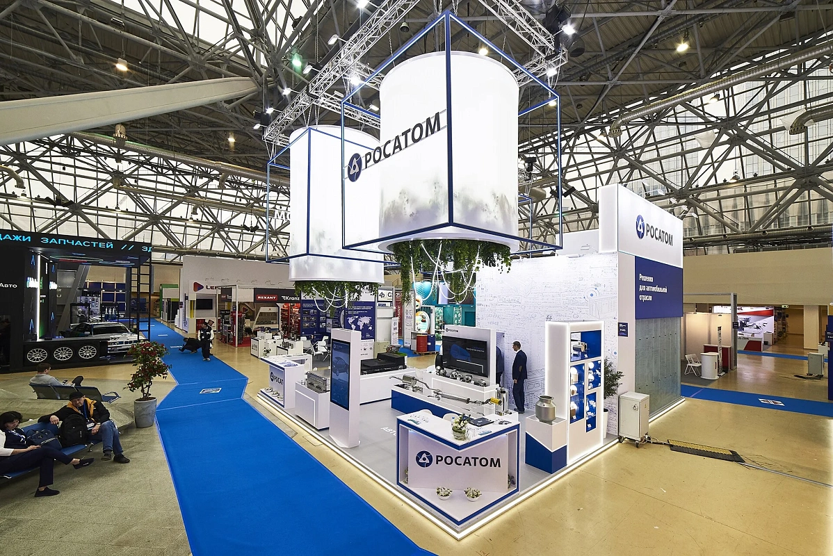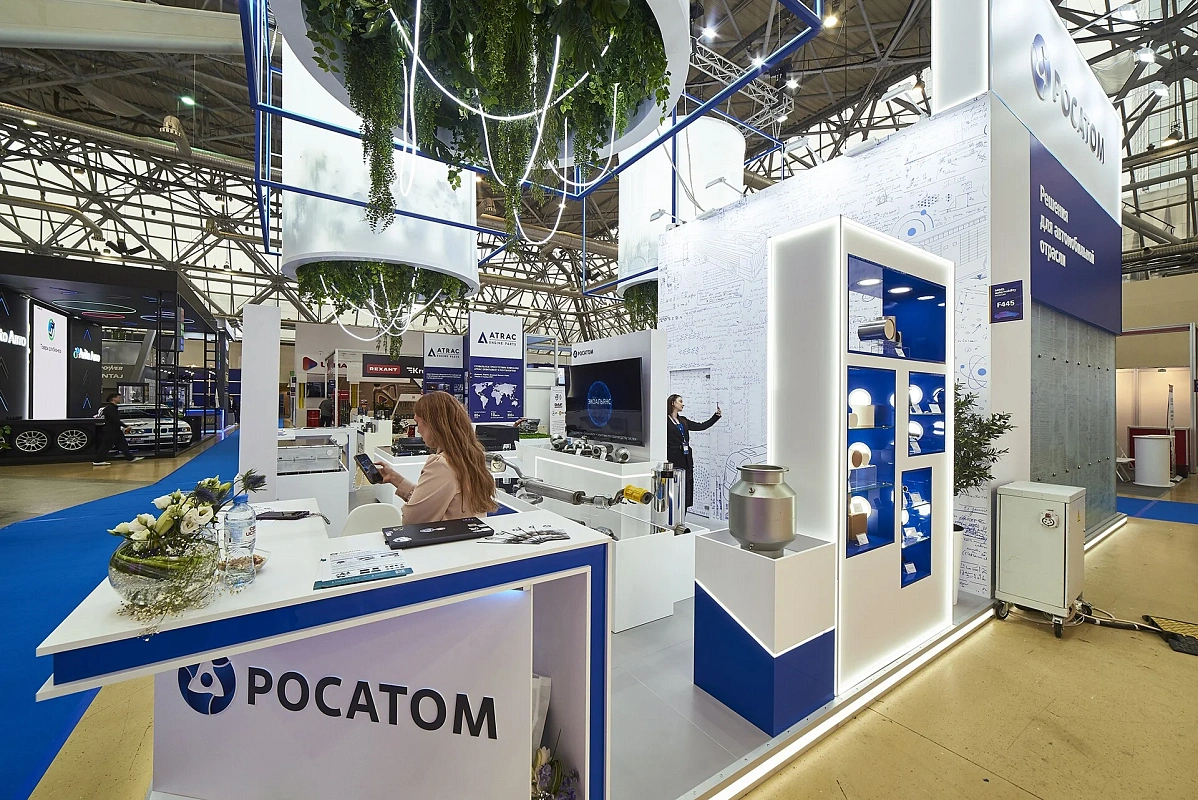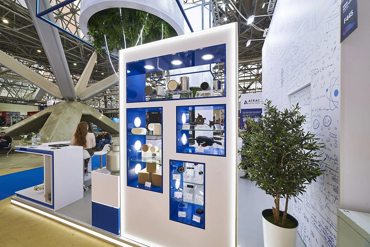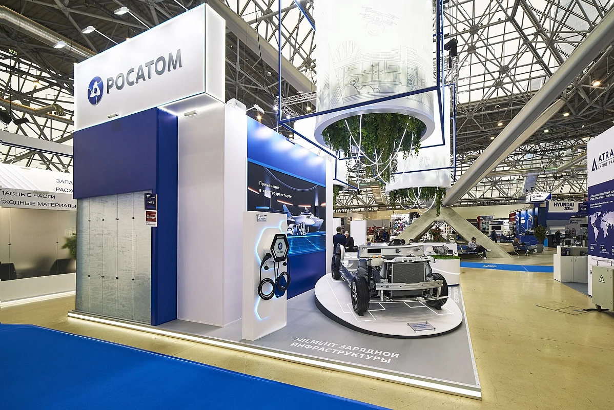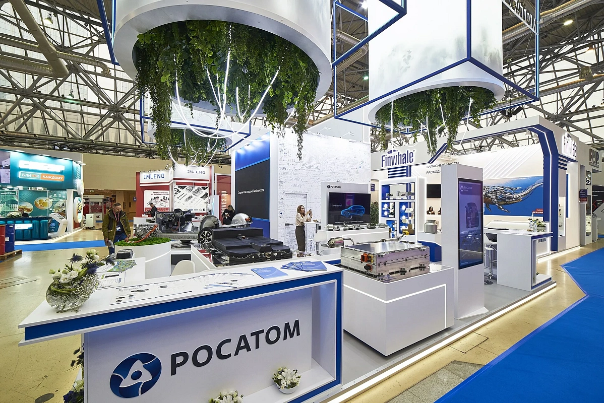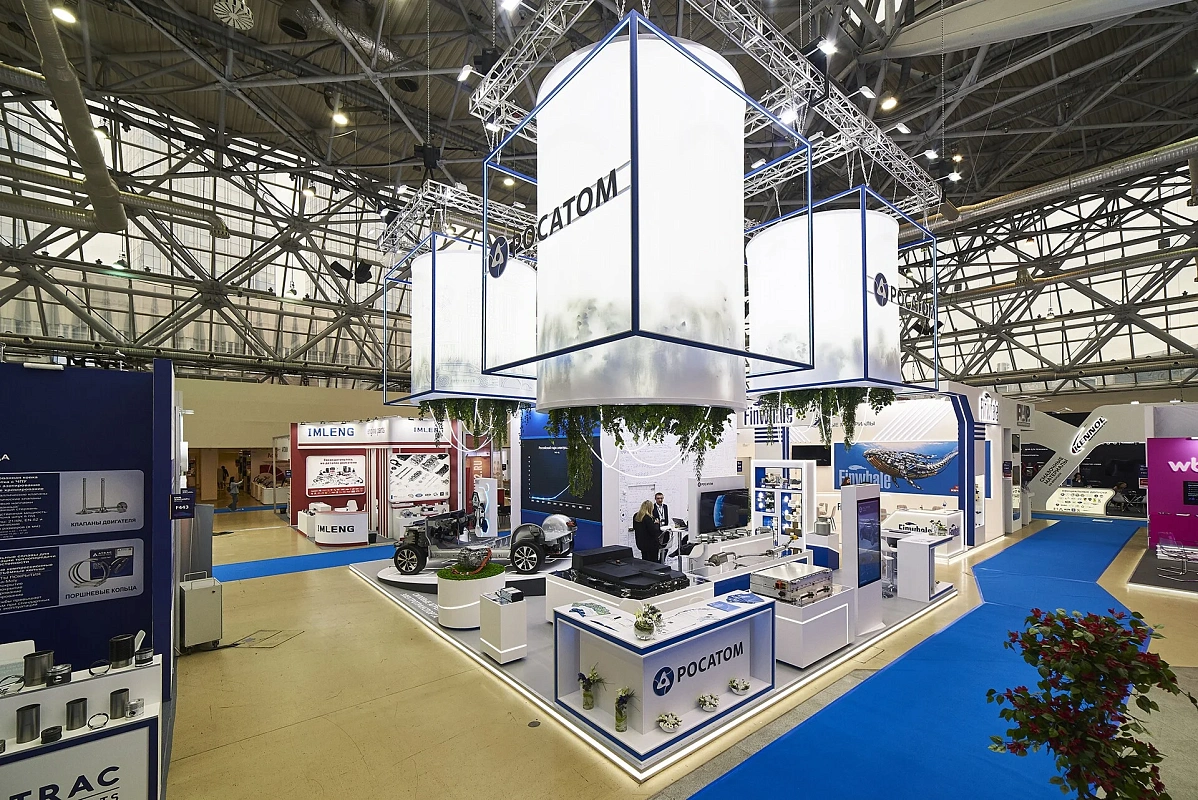 Световой подвес, подсветки создают ощущение легкости и воздушности. Вся площадь стенда максимально адаптирована для демонстрации продукции – от платформы электромобиля до мелких деталей.